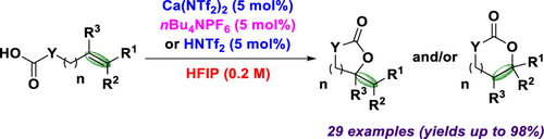 | 24. Calcium(II)- and triflimide-catalyzed intramolecular hydroacyloxylation of unactivated alkenes in hexafluoroisopropanol. Qi, C.; Yang, S.; Gandon, V.; Lebœuf, D. Org. Lett. 2019, 21 (18), 7405-7409. https://doi.org/10.1021/acs.orglett.9b02705 |