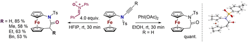 | 5. N-metallocenyl ynamides: preparation, reactivity, and synthesis of ansa[3]-ferrocenylamides. Mahe, C.; Blacque, O.; Gasser, G.; Gandon, V.; Cariou, K. Org. Lett. 2023, 25 (4), 624-629. https://doi.org/10.1021/acs.orglett.2c04169 |