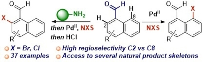 | 17. Palladium-catalyzed regioselective peri- and ortho-halogenation of 1-naphthaldehydes: application to the synthesis of polycyclic natural product skeletons. Amistadi-Revol, H.; Garrec, J.; Casaretto, N.; Prévost, S. Eur. J. Org. Chem. 2023, 26 (24), e202300359. https://doi.org/10.1002/ejoc.202300359 |